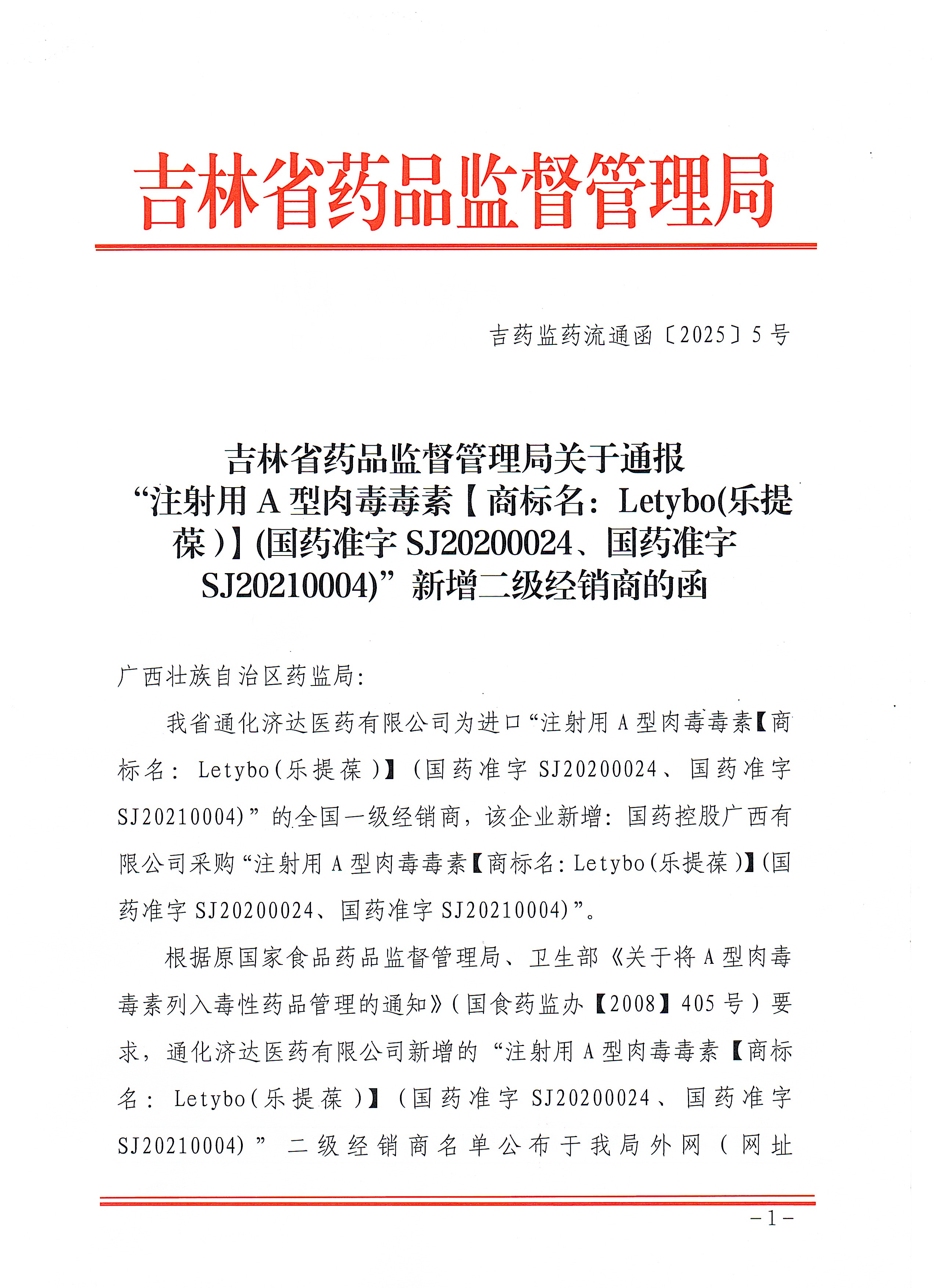 关于通报“注射用A型肉毒毒素【商标名:Letybo(乐提葆)(国药准字SJ20200024、国药准字 SJ20210004)”新增二级经销商的函 吉药监药流通函[2025]5号